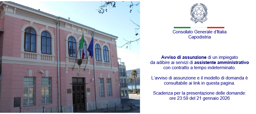Il Consolato Generale d’Italia a Capodistria rende noto che è indetta una procedura di selezione per l’assunzione di un impiegato a contratto da adibire ai servizi di assistente amministrativo.